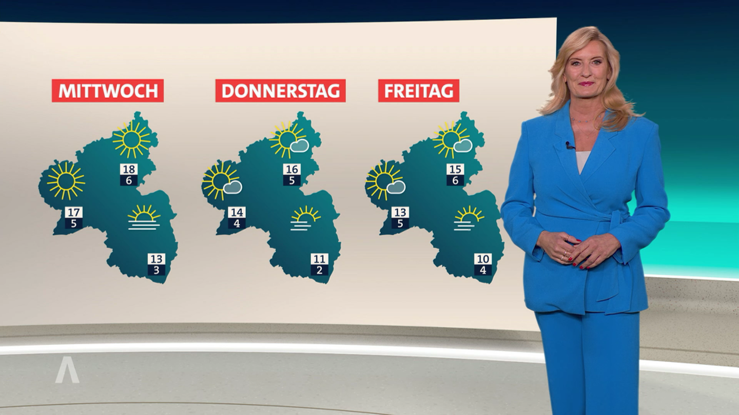 Das Wetter in Rheinland-Pfalz "Es wird sonnig in dieser Woche" Liste der Share-Möglichkeiten öffnen Teilen Gemerkt Merken Drucken Teilen Liste der Share-Möglichkeiten schließen Link kopieren E-Mail Facebook WhatsApp KurznachrichtendienstX Mastodon Bluesky Threads Stand 3.11.2025, 20:12 Uhr Zur Startseite der Sendung Zur Mediathek