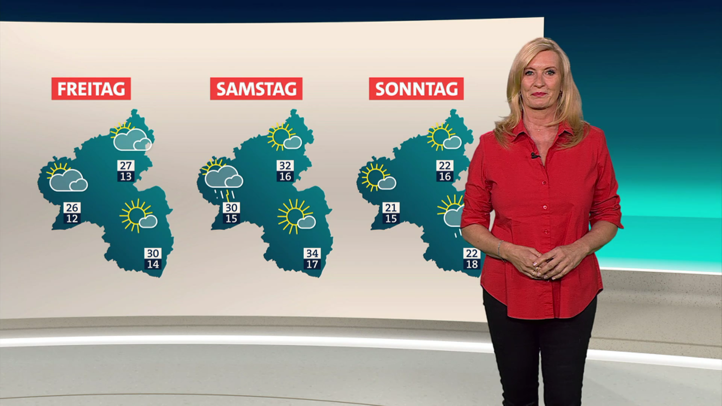 Es wird sonnig - und auch wieder heiß, sagt ARD-Wetterexpertin Claudia Kleinert. Am Donnerstag gibt es den ganzen Tag Sonne, bei Höchstwerten von 22 bis 27 Grad. Am Freitag sind bereits wieder 30 Grad möglich, am Samstag sogar bis 34 Grad. Dann gibts auch wieder erste Schauer und Gewitter in der Eifel.