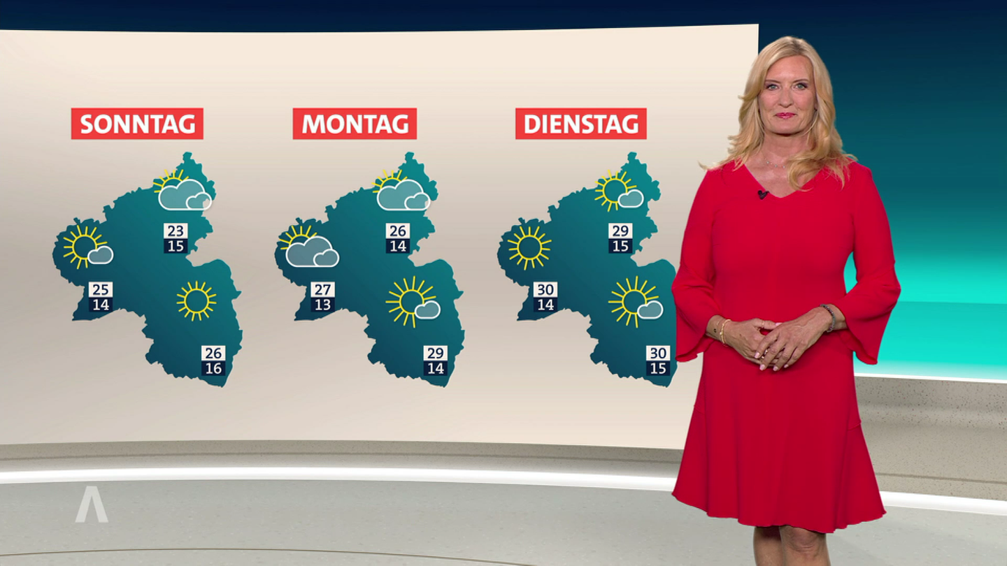 Es ist nicht mehr ganz so heiß in den kommenden Tagen. Doch es gibt weiterhin viel Sonnenschein, am Wochenende im Norden etwas weniger als in den übrigen Landesteilen. Entlang des Rheins nähern sich die Temperaturen der 30-Grad-Marke. Am Sonntag sind es dann noch angenehme 25 bis 26 Grad. Der Montag wird wieder wärmer, hat aber auch etwas mehr Wolken zu bieten.