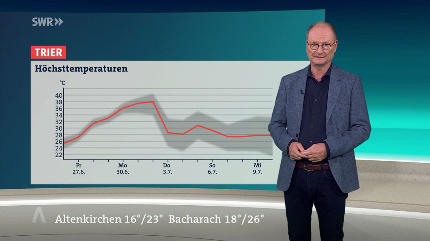 Und wie wird es zu Ferienbeginn in Rheinland-Pfalz am 7. Juli? Lässt sich etwas seriös vorhersagen? Schon da gebe es Unsicherheiten, sagt David Bötzel. Es gibt ihm zufolge Modelle, die kälteres und wechselhaftes Wetter vorhersagen, es gibt aber auch Modelle, die lassen das Ganze weiter im derzeitigen Bereich. Und Marcel Herber sagt, es sehe zum Ferienbeginn in RP so aus, als würden wir auf der Rückseite eines Tiefs hängen und vielleicht wieder kühlere Luft haben. Die Hitze über Südeuropa werde den Modellen zufolge in den nächsten 14 Tagen aber nicht verdrängt. Rücke ein Tief bis Spanien vor, könne erneut warme Luft über Frankreich zu uns fließen.