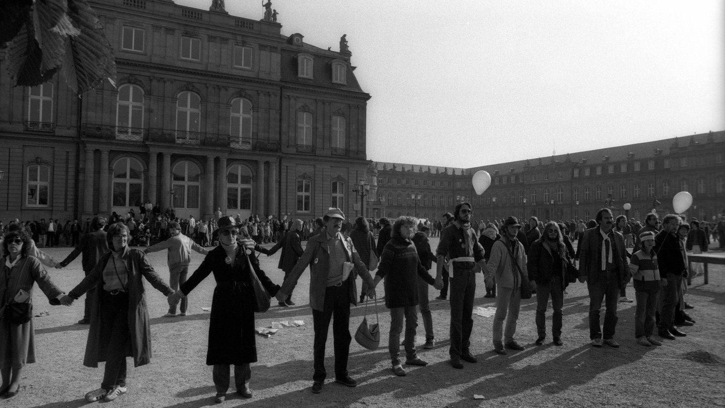 Die Menschenkette reichte von Stuttgart-Vaihingen bis Neu-Ulm, 108 km quer durch Baden-Württemberg. Die Raketen konnte auch diese Demonstration nicht verhindern.