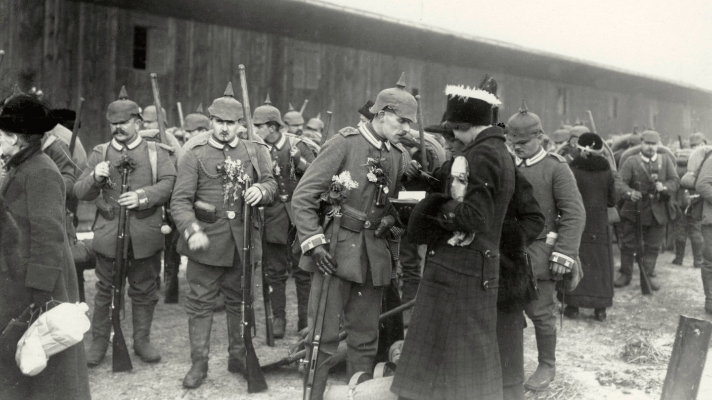 Abschied eines Weltkriegsteilnehmers von 1914: "Musikalischer Dialog" eines Soldaten mit seiner Freundin. Er glaubt, in Kürze wieder zurück zu sein, weil der Deutsche den anderen Soldaten überlegen ist.