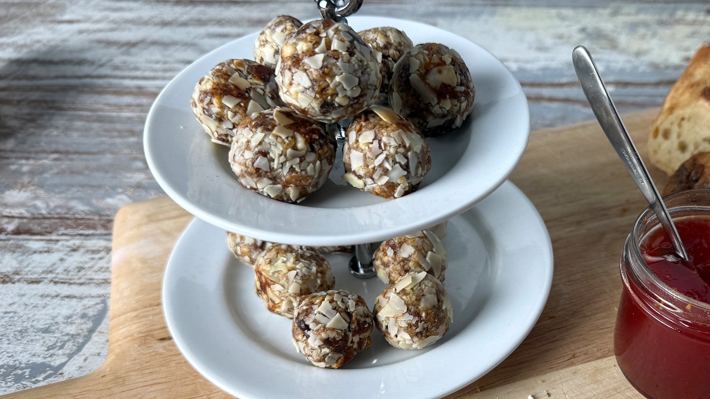 Feigenkonfekt mit Cashewkernen kugelt aus dem Backofen. Das Konfekt wird rund gerollt, in Mandelblättchen gewälzt und kurz gebacken. Einfach eine runde Sache!