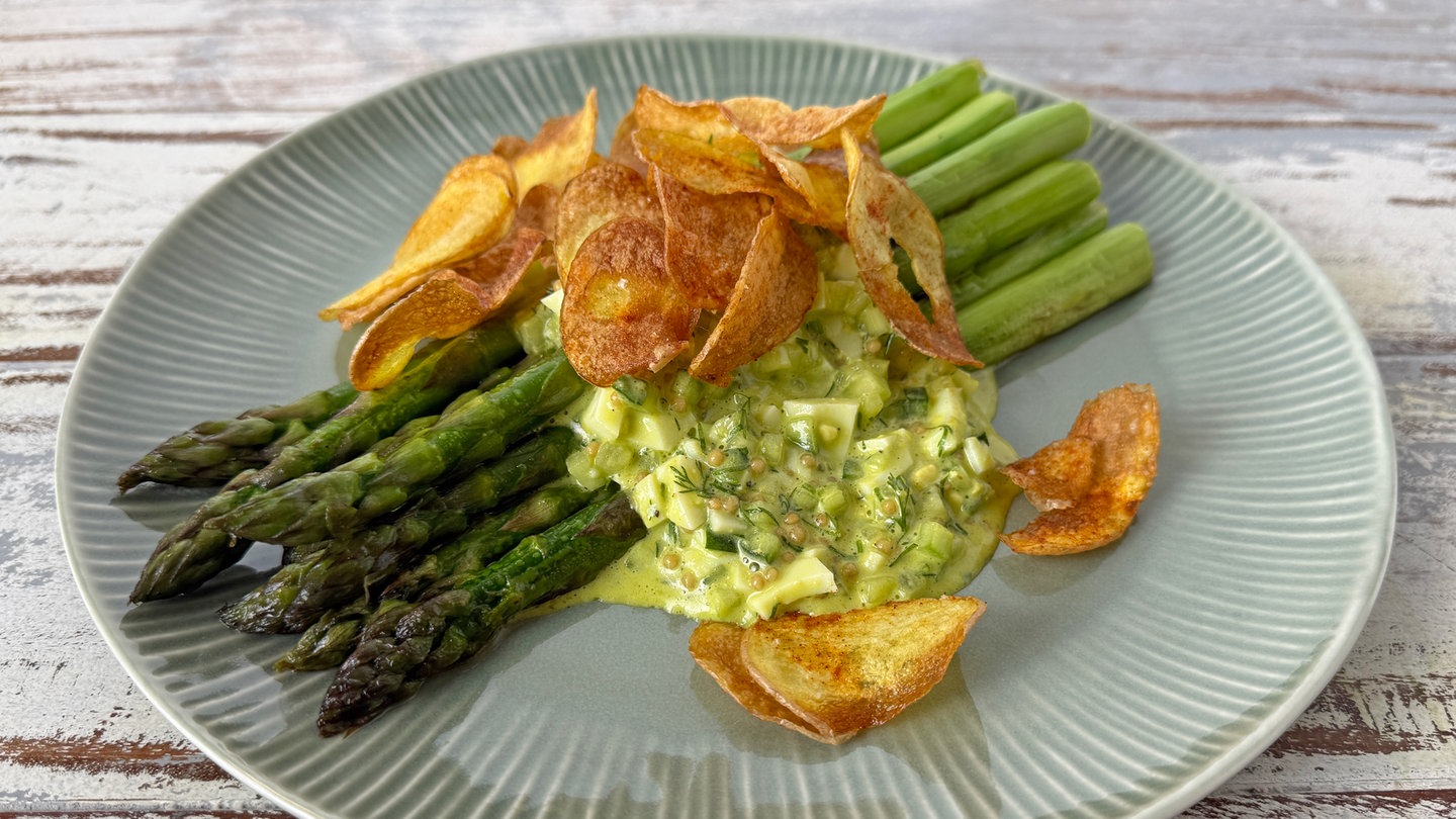 Luisa Jordan dünstet Spargel und serviert ihn mit einer Bärlauch-Hollandaise, die mit Gurken und Senfkörnern verfeinert wird. Dazu gibt es Kartoffelchips - einfach und köstlich.