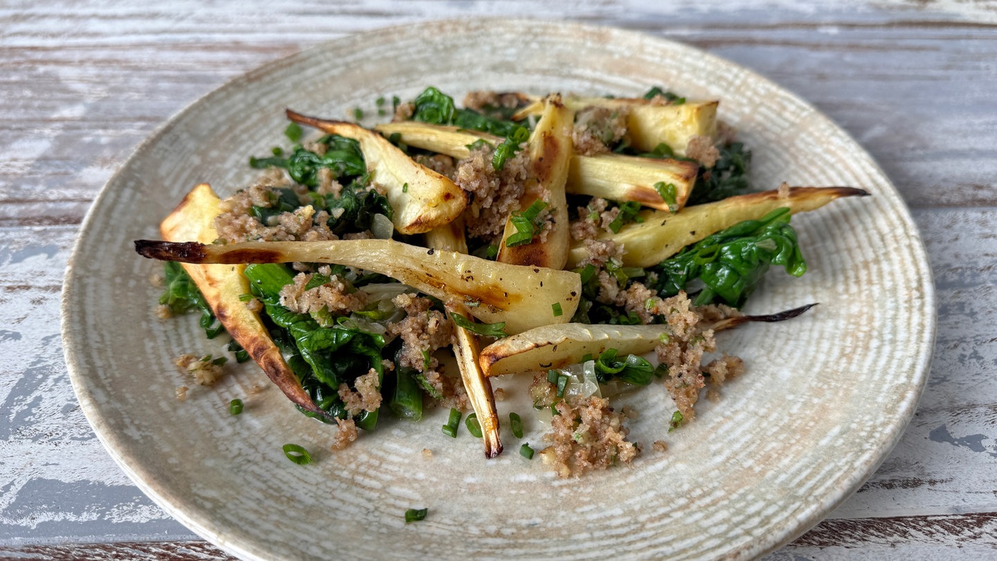 Eberhard Braun mariniert Pastinaken und gart diese im Ofen. Begleitet das Wurzelgemüse von gedünstetem Spinat und einem Walnusspesto.