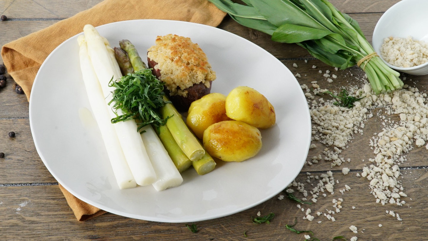 Timo Böckle brät Medaillons vom Rind, die mit einer Kruste aus Wacholder, Brotbröseln und Butter übergrillt werden. Dazu gibt es grünen und weißen Spargel und Bärlauchkartoffeln.