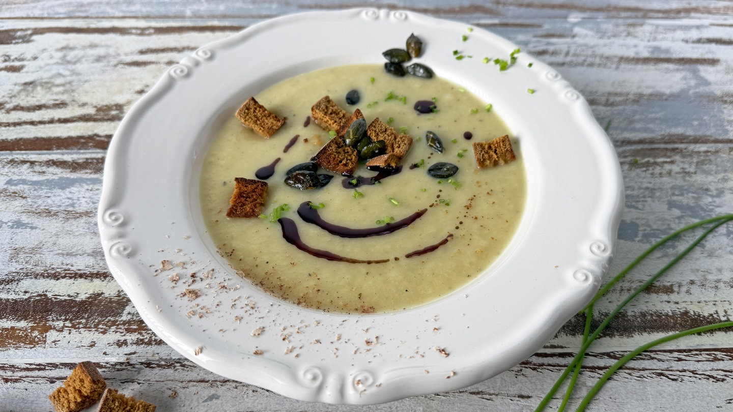 Vorspeise Weihnachtsmenü Sellerie-Birnencremesuppe mit Lebkuchen-Croûtons