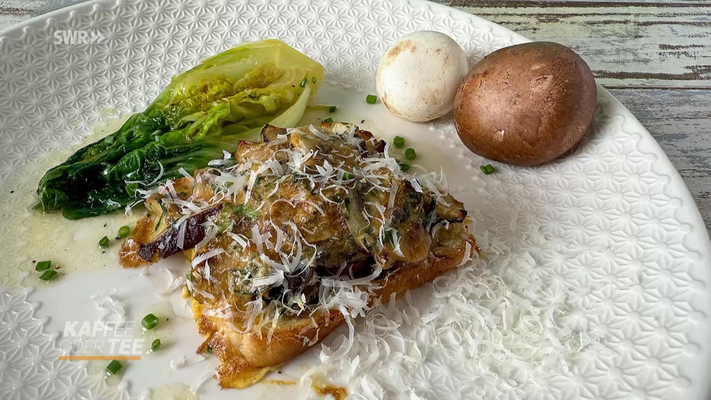 Sören Anders verarbeitet Pilze, gibt sie auf einen Toast und übebackt sie. Dazu wird er einen Romanasalat halbieren, karamellisieren und marinieren.