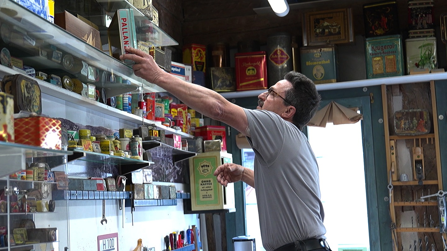 Helmut Gugel aus Tübingen hat seine Wände mit alten Metalldosen geschmückt. Das Spezielle an der Dosensammlung: Er hat sie nicht bei sich daheim, sondern an seinem Arbeitsplatz in seiner Werkstatt im Tübinger Stadtmuseum. Ob da jeder Chef davon begeistert wäre?