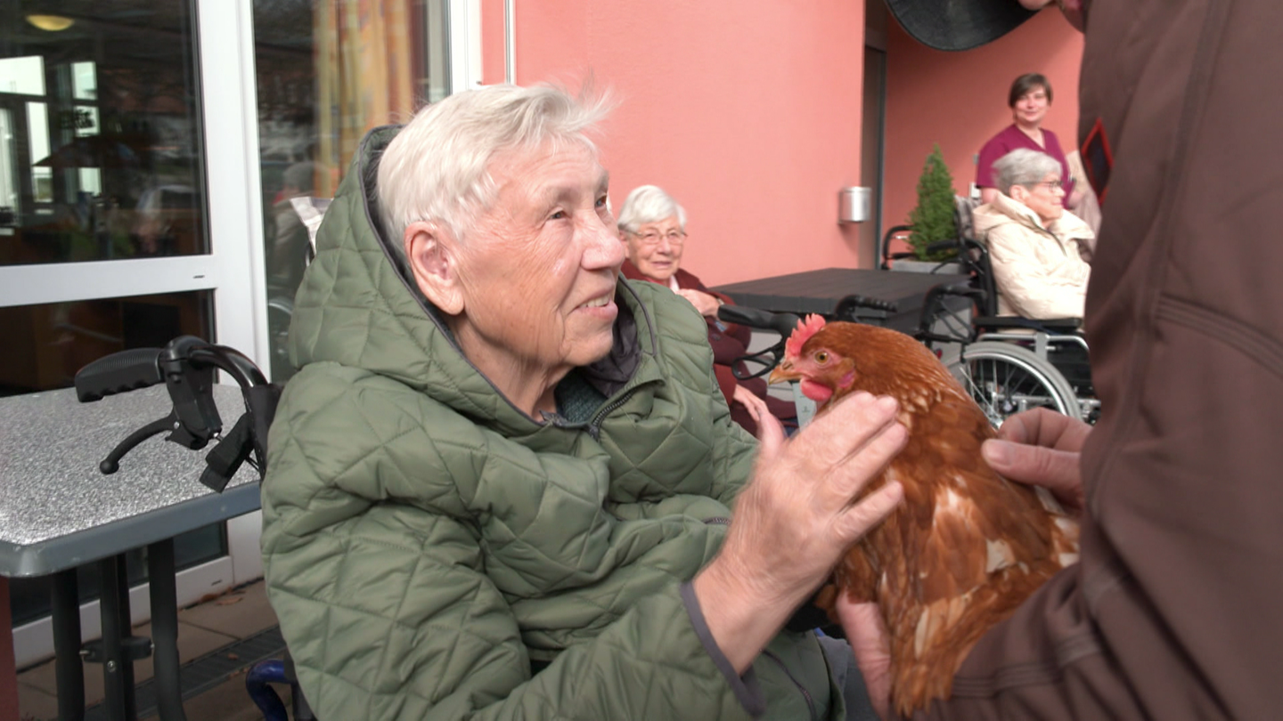 Passend zu Ostern hat das Seniorenheim Pfarrgarten in Mögglingen für zwei Wochen gefiederten Besuch im Garten. Die Hühner hat das Seniorenheim von Frank Hahn aus Ellwangen gemietet.
