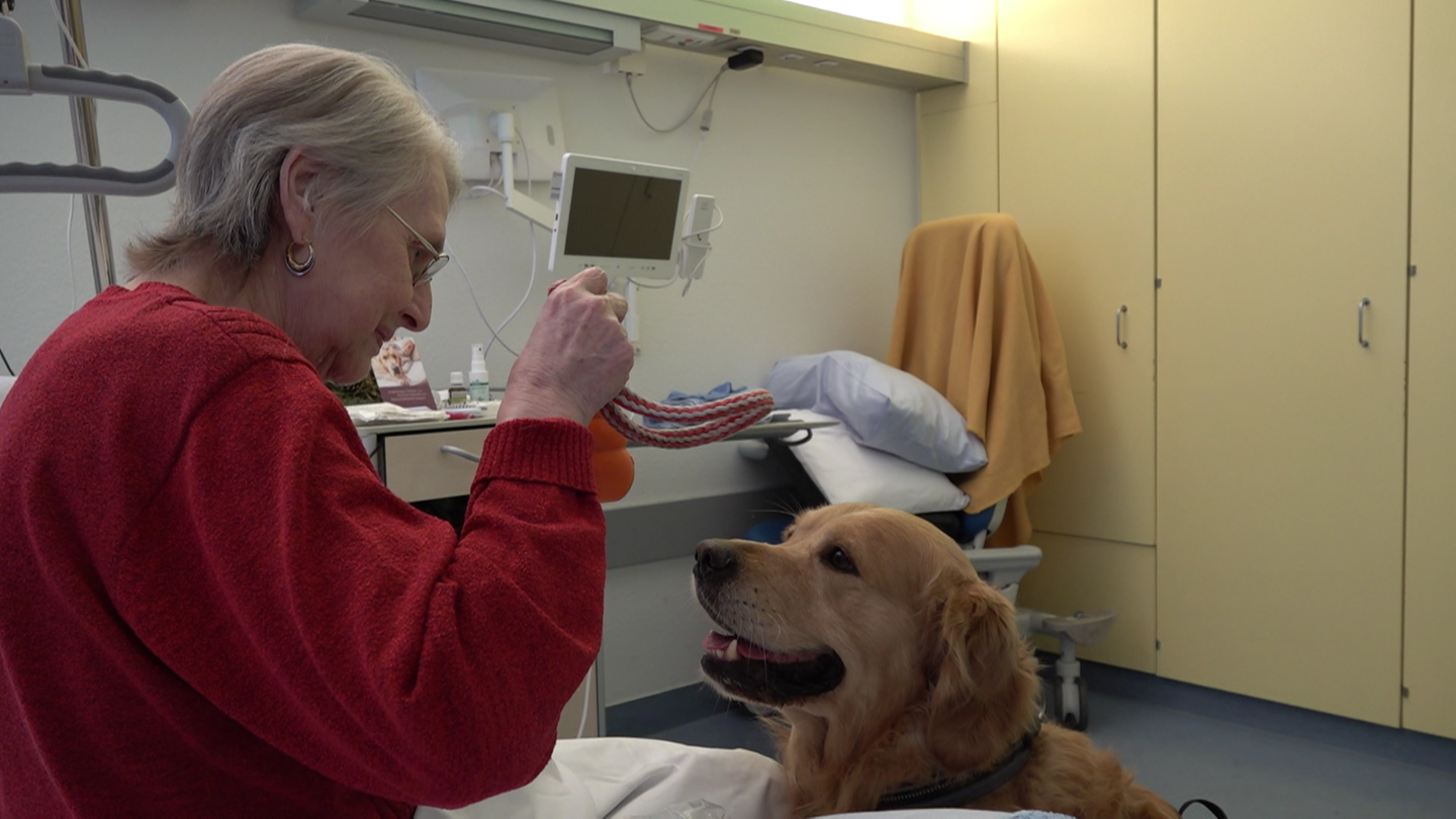 Als Besuchshund kommt Hannes alle zwei Wochen mit Frauchen Katja Rull auf die Palliativstation des städtischen Klinikums in Karlsruhe. Dort schenkt er Zeit, Ablenkung und Trost.