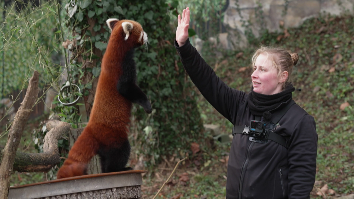 Der Zoo Karlsruhe hat eine eigene Artenschutzstiftung und engagiert sich damit unter anderem für den Schutz der roten Pandas und der Plumploris. Diese Projekte stellen Zoodirektor Matthias Reinschmidt und Kuratorin Sandra Dollhäupl Schülerinnen und Schülern der beruflichen Schulen Achern vor. In einem anderen Zoobereich wird die Giraffenkuh Wa-hia trainiert. Sie soll lernen ihren Huf für eine Pediküre auf eine Box zu stellen.