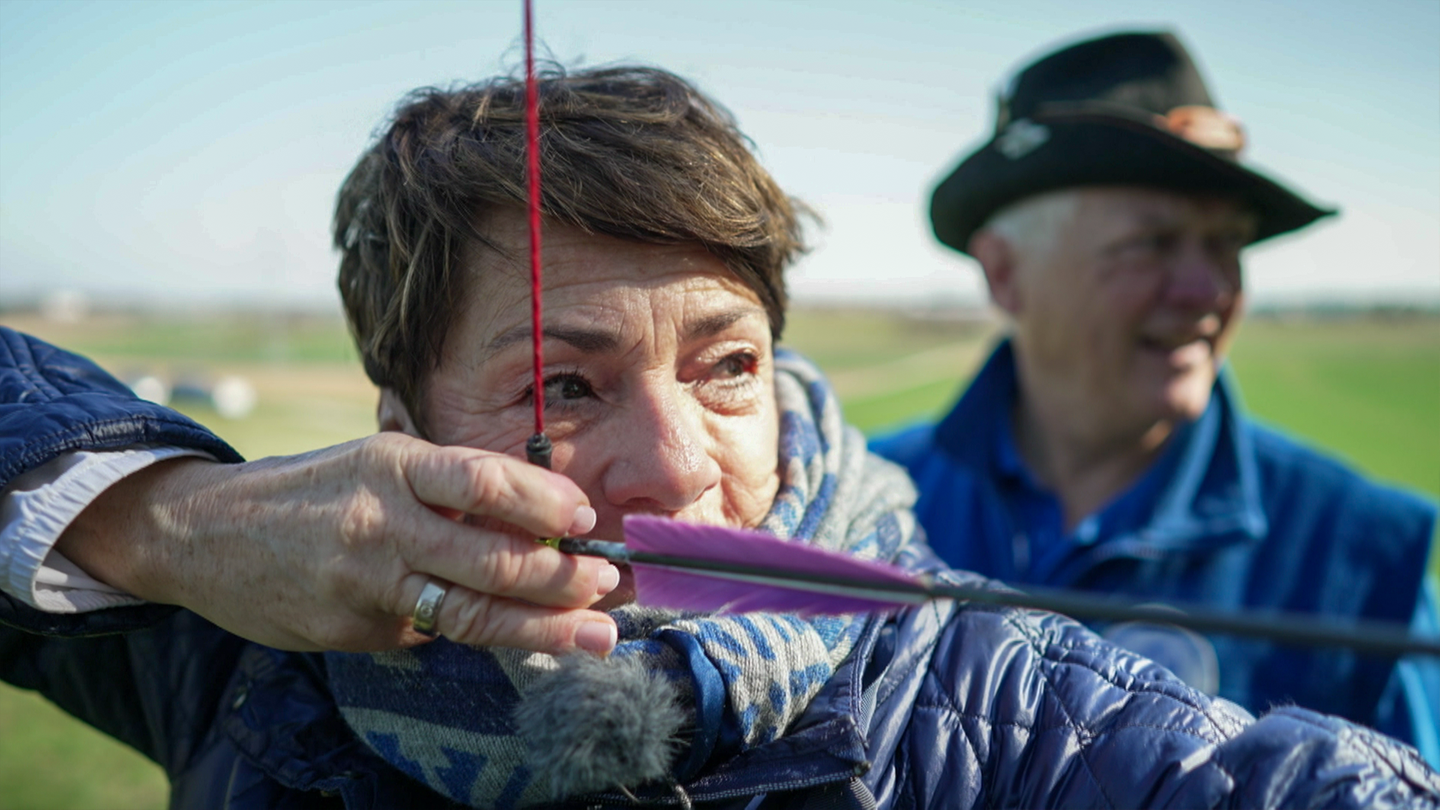 In Jettingen trifft Sonja Faber-Schrecklein die Feldbogengruppe. Mit Pfeil und Bogen bewaffnet, streifen die Vereinsmitglieder durch das Gelände und schießen dort auf Plastiktiere. Natürlich legt Sonja auch selbst an.