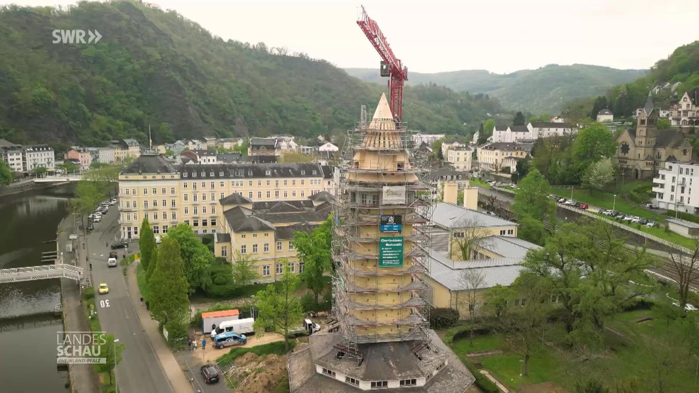 Ein Kran muss die drei Meter große Spitze der neuen Haube für den Bad Emser Quellenturm hochziehen. Die Zimmerer arbeiten auf 40 Meter Höhe.