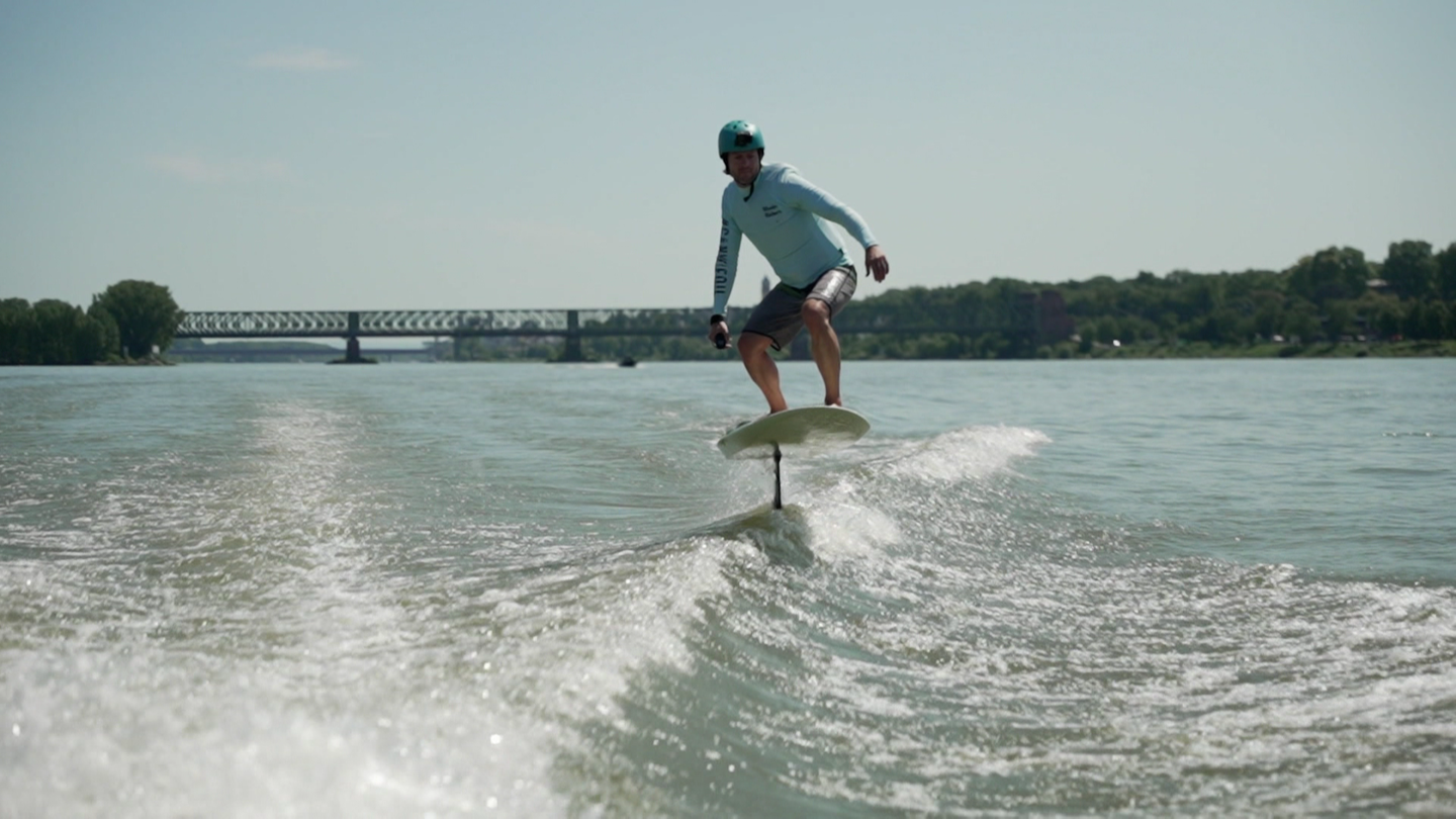 Erich Prasler hat als einer der Ersten das E-Foiling am Rhein für sich entdeckt, ohne Wind aber mit bis zu 40 km/h fliegt man dabei über die Wasseroberfläche. Heute bietet der 40-Jährige Kurse am Mainzer Zollhafen an, um anderen das Surfen mit Motor näherzubringen.
