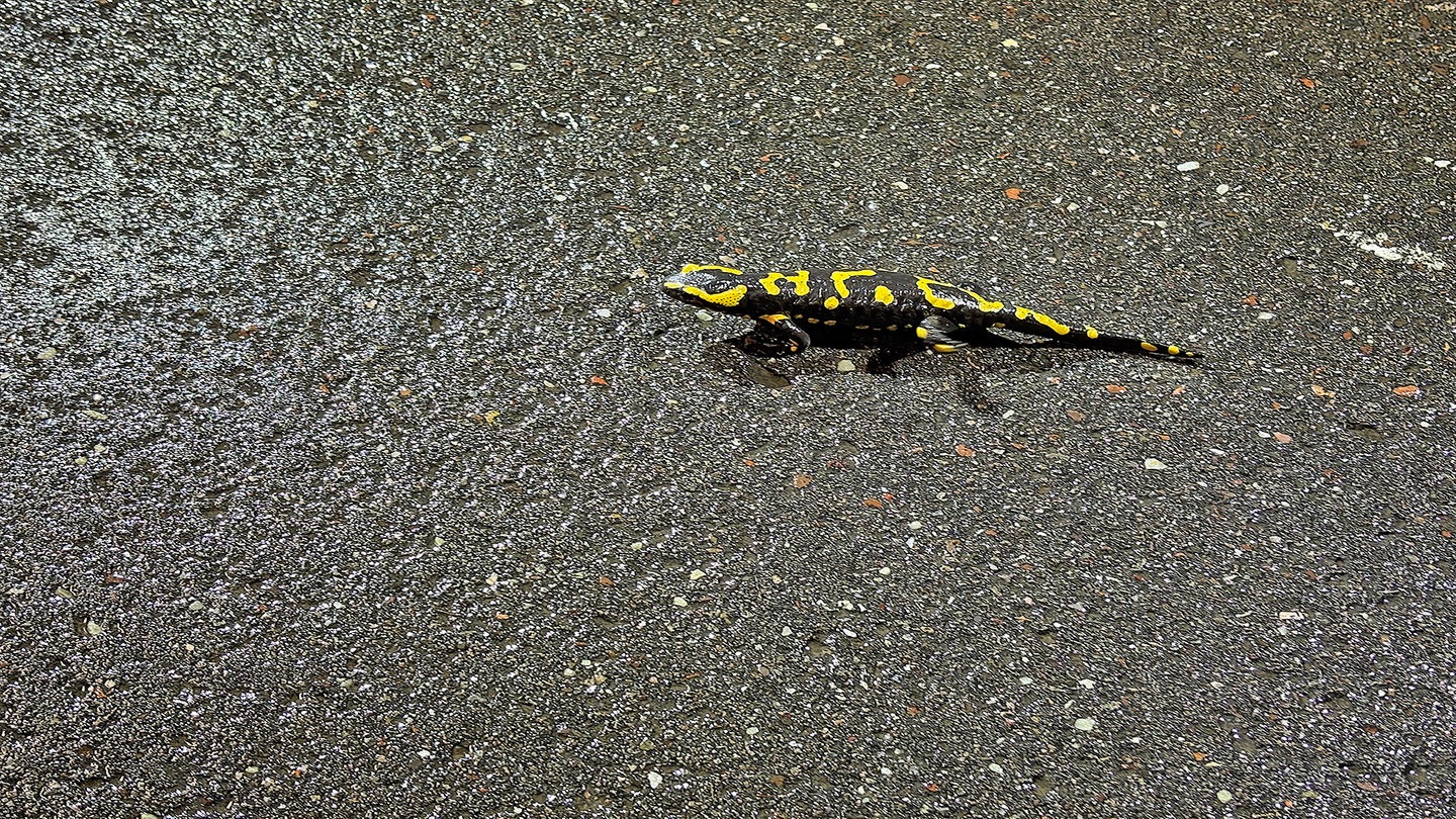 Auf einer Kreisstraße bei Wachenheim sind sehr viele Feuersalamander unterwegs. Autos dürfen dort nachts eigentlich nicht fahren. Trotzdem sterben viele Tiere, weil Autofahrer die Sperrung missachten und keinen Umweg fahren wollen.