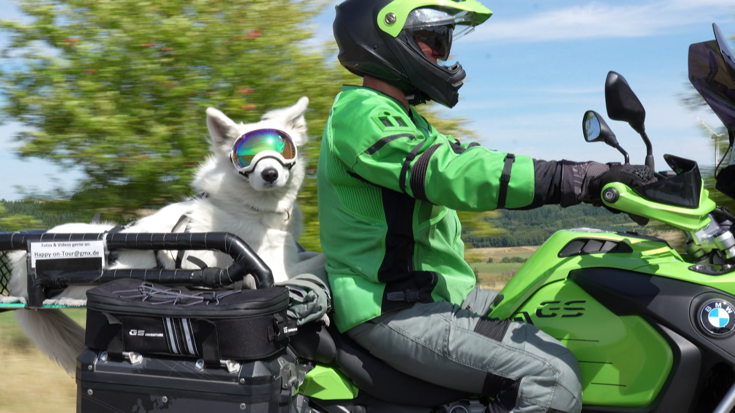 Heiko Goerlich aus dem Hunsrück und seine Hündin Happy sind ein ungewöhnliches Team: Happy fährt sicher angeschnallt auf dem Motorrad mit. Über 8000 Kilometer sind Herr und Hündin schon miteinander herumgecruist. Mit einem selbstgebauten Sitzplatz, Sicherheitsgurten und cooler Brille genießt die junge Hündin jede Fahrt.