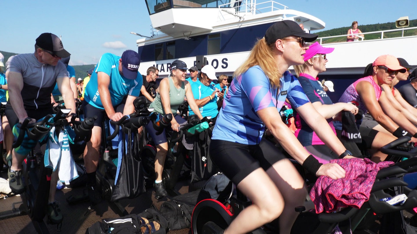 Ab und zu verwandelt sich die Rheinfähre "Mary Roos" in Bingen in ein schwimmendes Cycling-Studio: 225 Sportlerinnen und Sportler strampeln im Takt und genießen dabei die Rhein-Atmosphäre.