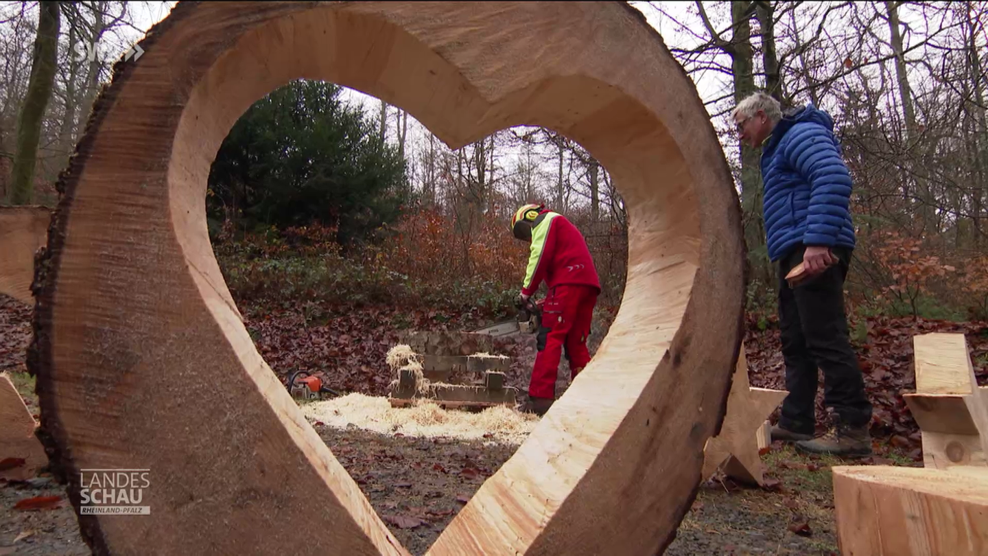 Förster Albert Scheppe schnitzt mit der Kettensäge Engel und Sterne, um den Besuchern des FriedWalds Wildenburger Land im Advent eine schöne Kulisse zu bieten.